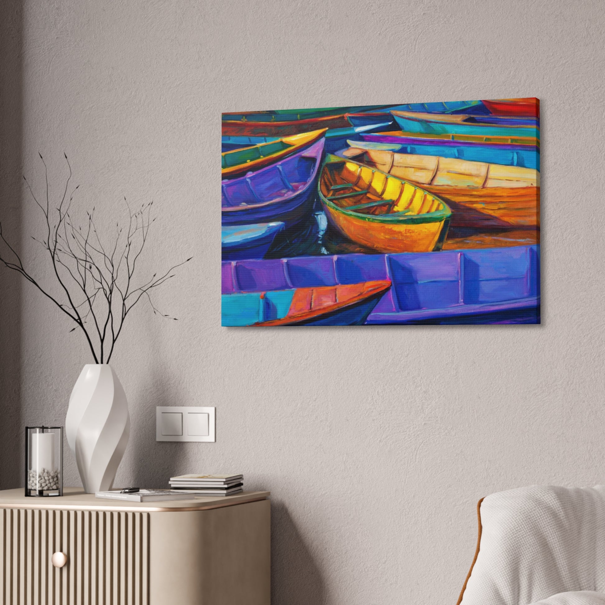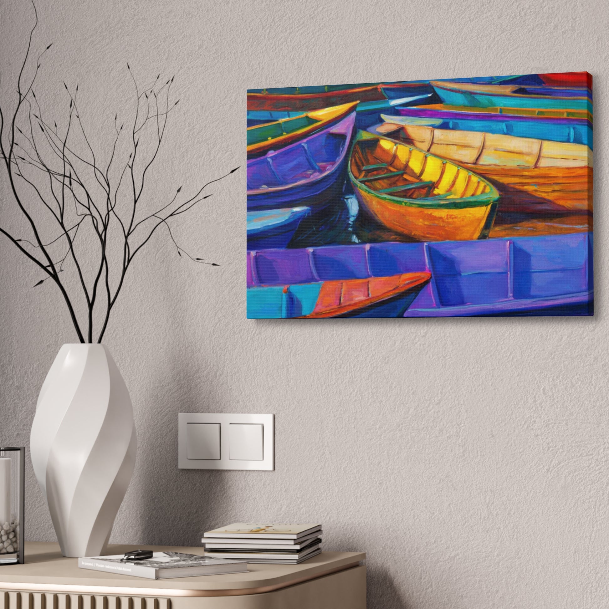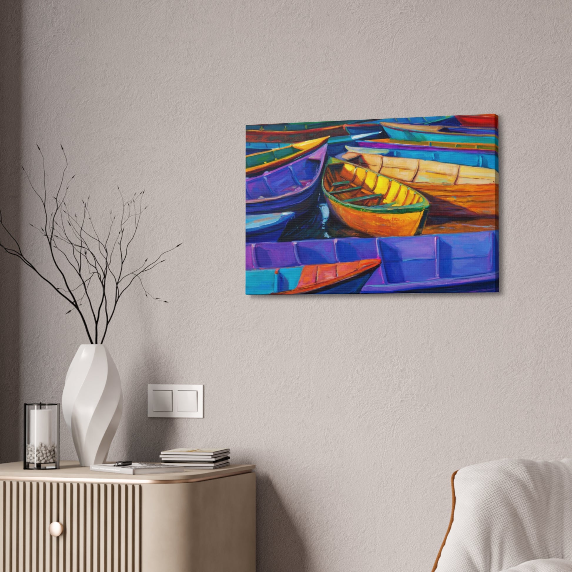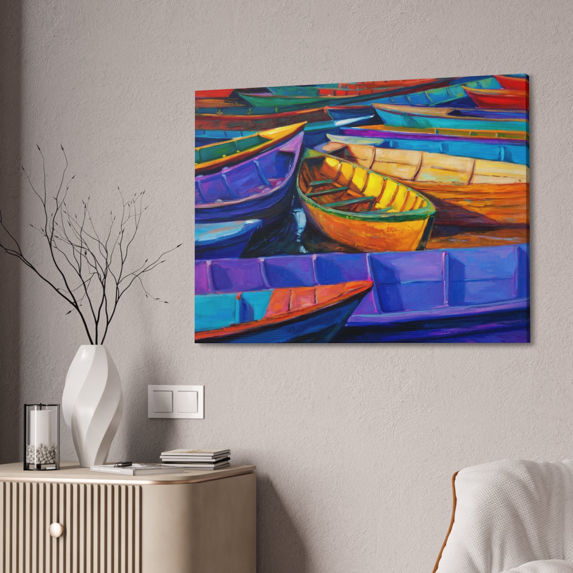 Experience the camaraderie of the sea with "Elevated Drift: Rafting Up the Tides." This artwork captures a group of boats gently drifting together, symbolizing unity and shared journeys. The serene composition and harmonious colors make it a perfect addition to any nautical-themed space.